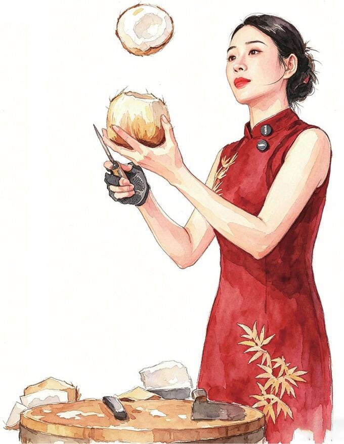 今如,骑楼老街的椰子摊前吴雪依然时常站正在,地削着椰子一刀一刀,地扔着椰蛋一颗一颗,椰影间正在刀光,从远处奔赴而来的搭客迎来送往一批又一批。手中正在她,润的椰子蛋剖开的是莹,练酿为清甜的故事也是一段将生计历。