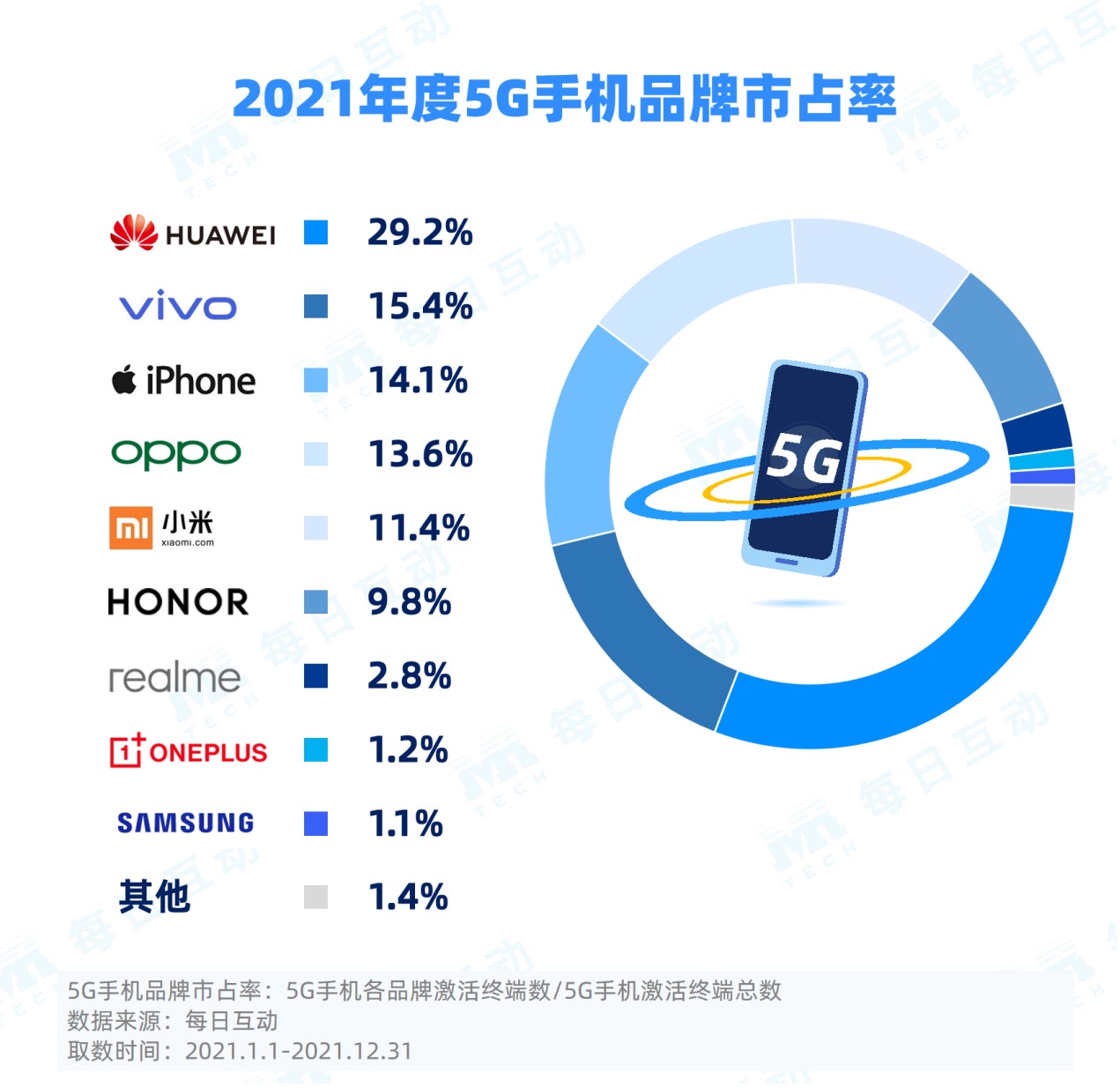 数据显示逐日互动,2%的市占率华为以29.,5G手机墟市赓续领跑国内;占率排名第二vivo市,.4%达15;赓续爆棚市占率达14.1%iPhone5G手机热度,第三排名,六位的市占率排名较2020腊尾第,3个位次上升了;%的市占率排名第四OPPO以13.6;达11.4%幼米市占率,第五排名。