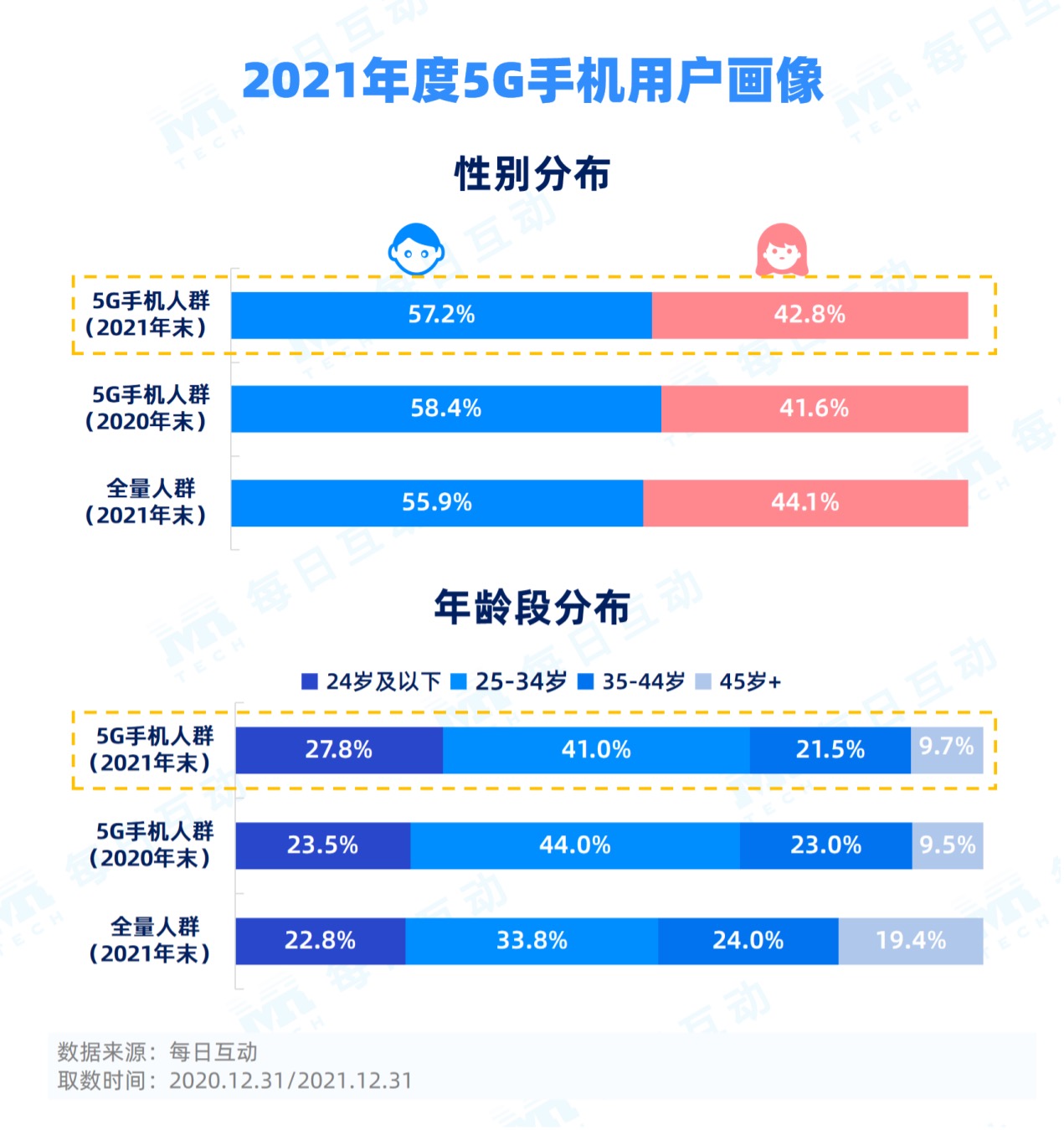 大数据显示逐日互动,散布来看从性别,女性占比达42.8%2021腊尾5G手机。比例差异逐步缩幼5G手机男女性别,群的比例趋近正与全量人。