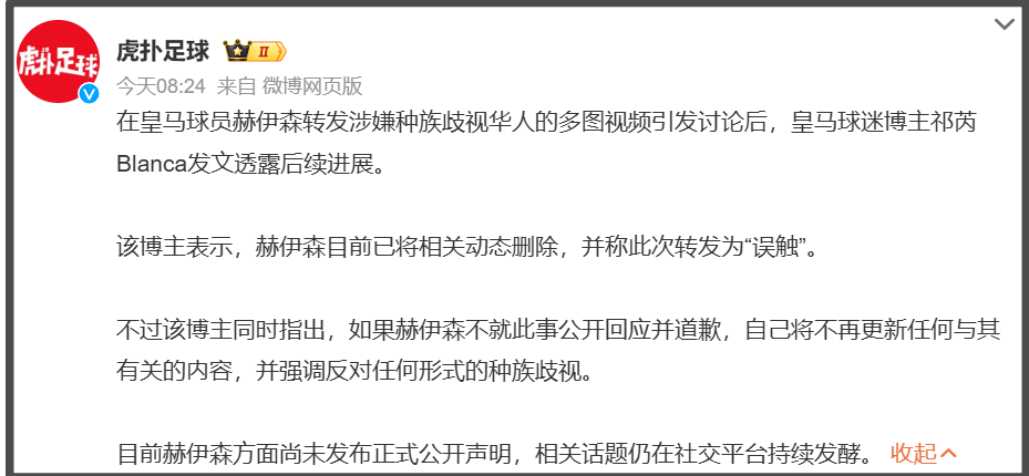 笑部双标行动面临皇马俱,友愤慨了中国网,评论区陷落赫伊森社媒,干系动态他删除了,伊森解析到了议论争议删除行动也意味着赫,没有告罪不过仍然。