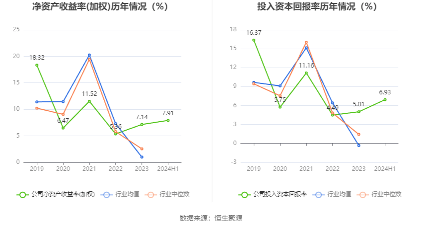 显示数据,均净资产收益率为7.91%2024年上半年公司加权平,4.48个百分点较上年同期伸长;入资金回报率为6.93%公司2024年上半年投,4.52个百分点较上年同期伸长。