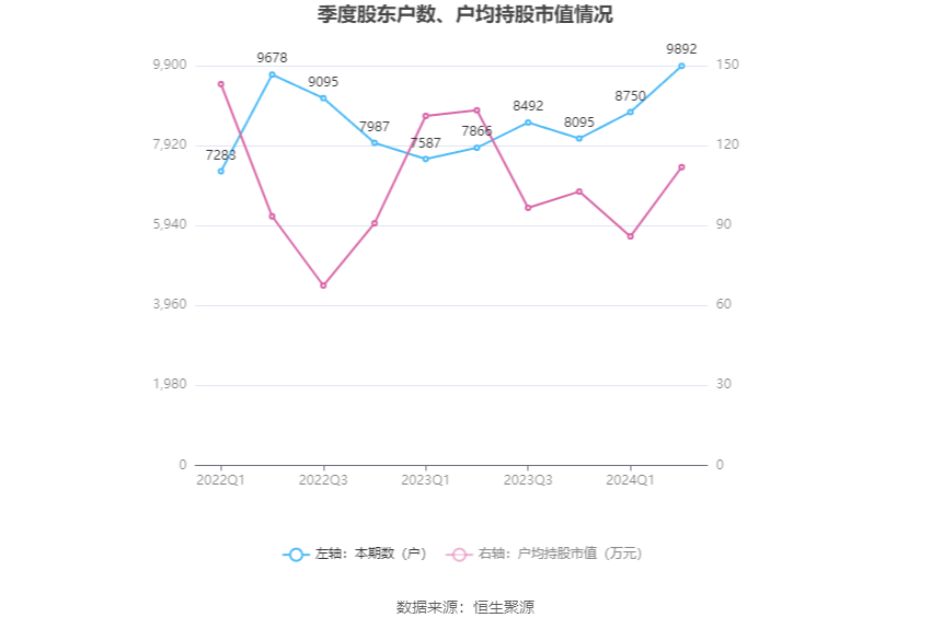 中度方面筹码集,4年上半腊尾截至202,数为9892户公司股东总户,长了1142户较一季度末增,.05%增幅13;90万元上升至111.92万元户均持股市值由一季度末的85.,0.29%增幅为3。